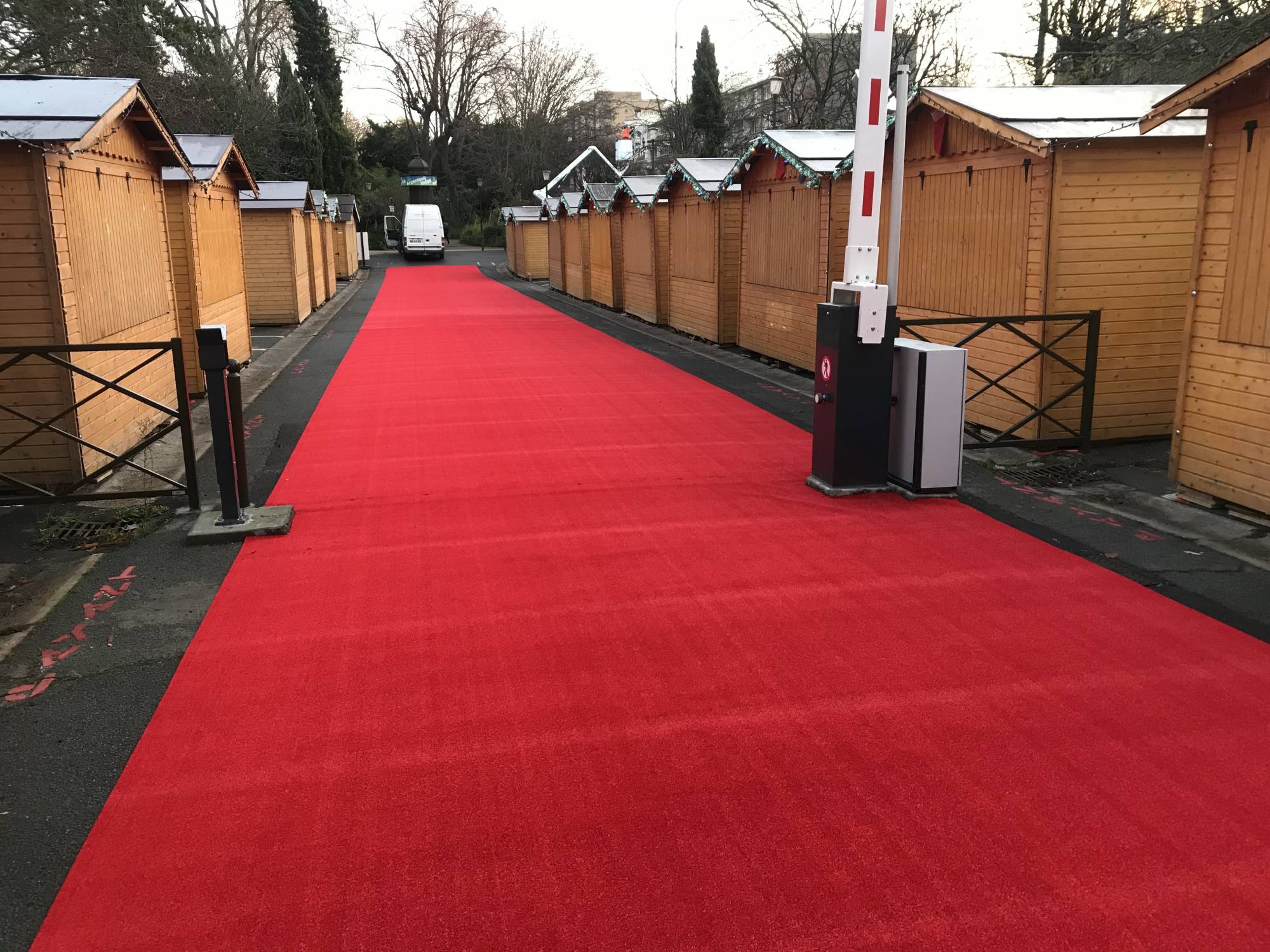 Pose de gazon synthétique couleur rouge pour le marché de noël d'Argenteuil
