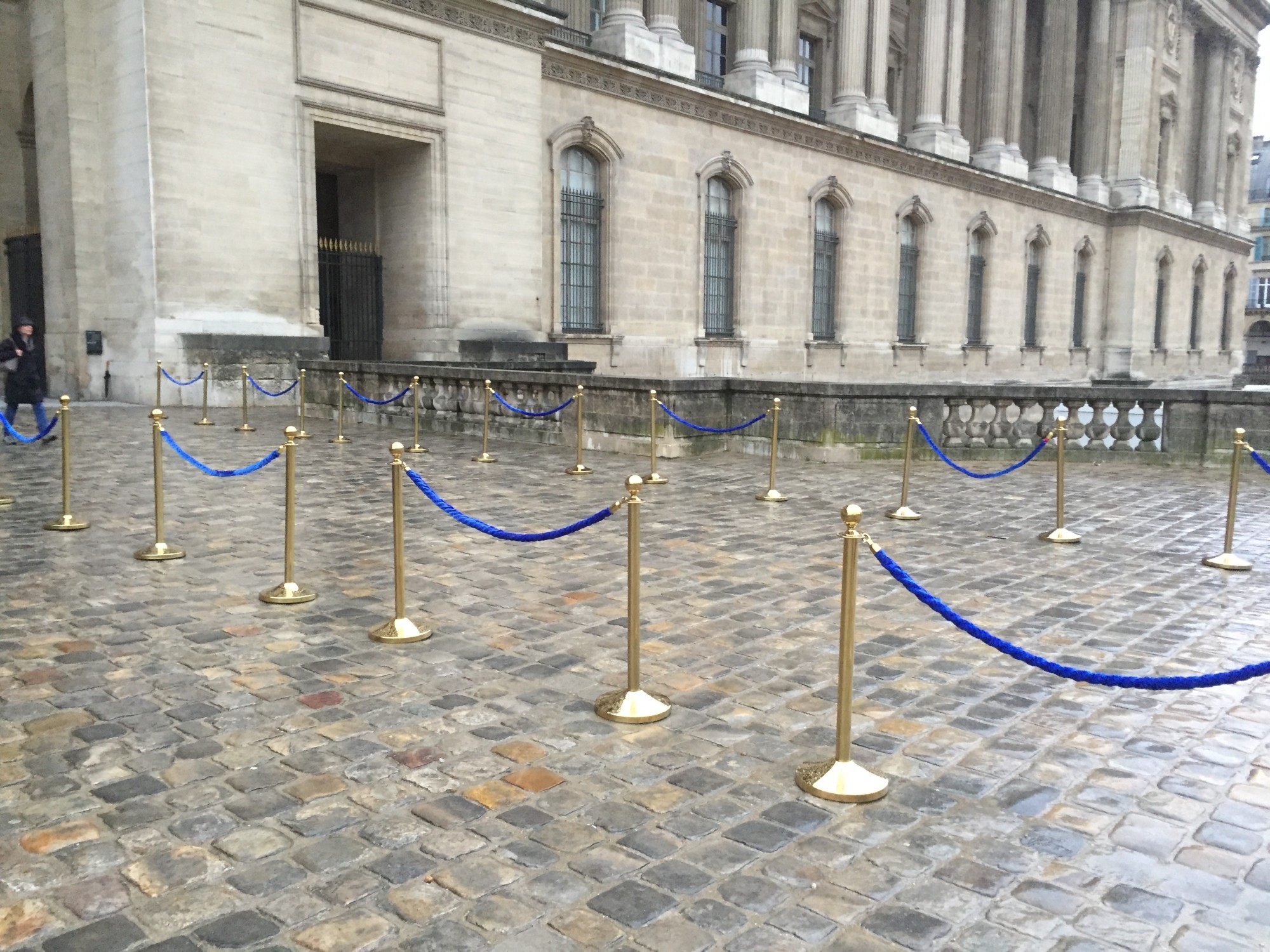 Location et mise en place de poteaux dorés à corde bleue pour un tournage de film au musée du Louvre.